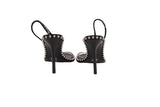 These Alexander Wang heels feature a sleek black leather footbed paired with a transparent clear PVC strap for a modern, minimalist silhouette. Silver-tone stud detailing frames the sole, adding signature edge and visual contrast. Finished with a slim stiletto heel, this design blends contemporary structure withbold luxury appeal.
