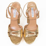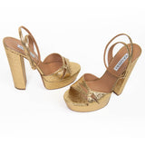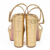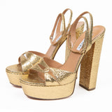 Aquazzura Sinner Plateau 140 Leather Platform Sandal, a stunning addition to any fashion-forward woman's wardrobe. With a strappy design and gold-tone hardware, this sandal is both sophisticated and sexy, showcasing the brand's signature style. Made in Italy with soft gold mosaic leather, the sandal features an adjustable ankle strap with buckle closure and a lightly padded leather insole for added comfort. The smooth leather sole provides traction and durability, and with a towering 5.75 inch heel and 1.5 inch platform