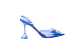 These Amina Muaddi Begum slingback heels are crafted in clear blue plexi vinyl with sculpted geometric heels and signature crystal buckle embellishments. Modern and architectural in design, they blend transparency, bold color, and standout sparkle for an elevated, fashion-forward finish. A striking statement heel perfect for evening looks, events, or editorial styling.