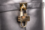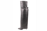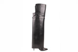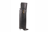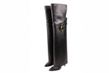 These Givenchy Lock Tall Boots feature a dramatic over-the-knee silhouette with sleek black leather construction and signature padlock hardware at the top of each boot. The pointed toe and slim heel add height and elegance, creating a sculpted high fashion look. A standout statement boot that elevates denim, dresses, and structured outerwear while embodying Givenchy’s signature bold luxury aesthetic.