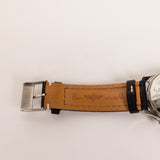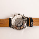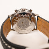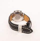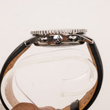 This Breitling Navitimer Chronograph is an iconic pilot’s timepiece, combining precision engineering with a bold, technical aesthetic. The black dial features three contrasting silver subdials, a red chronograph seconds hand, and luminous indexes for enhanced visibility. The signature circular slide-rule bezel allows for complex aviation calculations, while the stainless steel case delivers durability and classic appeal. Paired with a black leather strap accented by white stitching, this watch embodies both functionality and luxury craftsmanship.