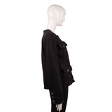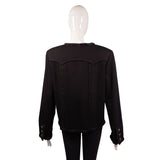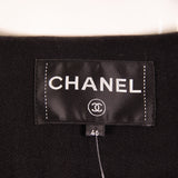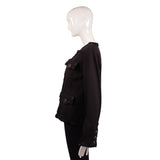 This classic Chanel jacket is tailored from rich black tweed with the signature four front flap pockets for timeless Parisian polish. The piece features subtle textural paneling, raw-edge trim along the placket and cuffs, and embossed Chanel buttons that add elegant detail. Fully lined and beautifully structured, it layers effortlessly over dresses or denim for a refined day-to-night look.