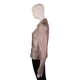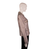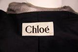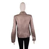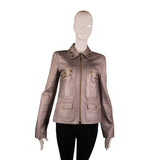 This Chloé jacket is crafted from luxe silver pewter metallic leather with a sleek, structured silhouette. It features a full front zip closure, flap and zip pockets at the chest and hips, and gold-tone snap hardware that adds a polished, utility-chic edge. The classic collar and tailored fit make it a standout layering piece that transitions effortlessly from day to night.