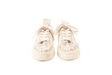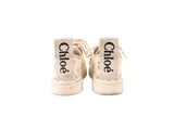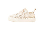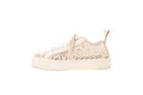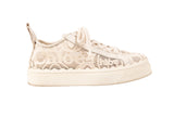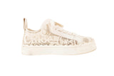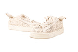 These Chloe lace low sneakers are crafted in white and cream mesh lace with leather trim, creating a feminine take on a casual silhouette. Featuring scalloped detailing, lace-up closure, and a sturdy rubber sole, these sneakers offer elevated style with everyday comfort. Lightweight, breathable, and signature Chloe design.