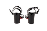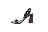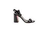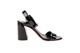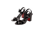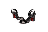 These Christian Louboutin ankle heels are crafted from glossy black patent leather and feature a refined open-toe silhouette with an adjustable ankle strap. Finished with the brand’s iconic red lacquered soles, they offer polished sophistication ideal for evening or formal occasions.