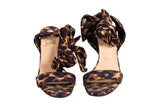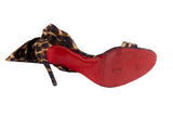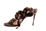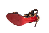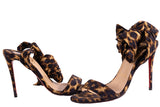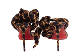 These Christian Louboutin wrap heels feature a bold cheetah print satin upper in rich brown, tan, and black tones. Designed with an elegant open-toe silhouette, they are finished with dramatic wrap-around ankle ties for a striking, feminine look. The signature red lacquered sole completes the design, making these heels a standout statement piece for evening wear or elevated styling.