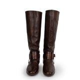 Crafted from supple brown grained leather, these Gucci Tall Riding Boots feature an equestrian-inspired silhouette with gold-tone buckle harness straps and subtle embossed GG logo detail near the ankle. Designed for both style and comfort, the flat leather sole makes them perfect for all-day wear.