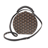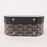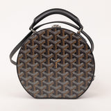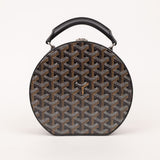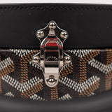 The Goyard Alto Hatbox Trunk in classic black Goyardine canvas embodies the brand’s timeless craftsmanship. This structured crossbody and top-handle piece features Goyard’s signature chevron pattern, palladium-finish hardware, and a detachable leather strap. Inspired by vintage travel trunks, the Alto offers a distinctive circular shape and a compact yet functional interior.