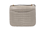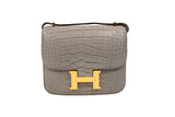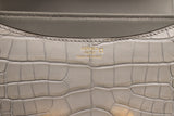 This Hermès Constance Mini is crafted from luxurious matte gray alligator, showcasing the natural, symmetrical scale pattern that defines exotic Hermès pieces. The iconic gold-tone H clasp adds a striking contrast to the soft gray tone, creating a refined, elegant silhouette. Compact yet structured, this rare Mini 18CM is highly coveted and ideal for both day and evening wear.