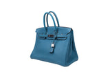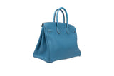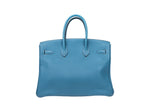 This Hermès Birkin 35 is crafted from Togo leather in the coveted Blue Jean colorway and accented with palladium hardware. Spacious and refined, it remains one of the most iconic luxury handbags ever created.