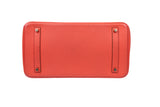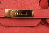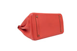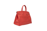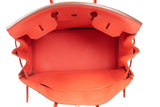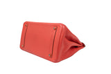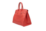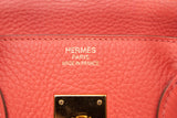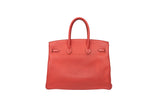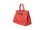 This Hermès Birkin 35 is crafted from Togo leather in a bold coral colorway and accented with gold hardware. A statement piece that balances luxury and practicality.