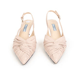 The Prada Nude Knot Leather Kitten Heels 37 exude timeless elegance and refined femininity. Crafted from supple nude calfskin leather, these heels feature intricate twisted knot detailing across the front, creating soft draping that enhances the shoe’s sculptural form. The pointed toe elongates the leg while the slender kitten heel provides just the right touch of elevation for everyday sophistication or evening occasions.