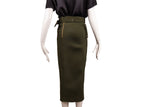 This Self-Portrait skirt is crafted in structured olive green cotton with a flattering ruched front design and full button-front closure. Finished with a matching belt detail and utilitarian-inspired tailoring, it offers a refined yet modern silhouette that transitions seamlessly from day to evening styling.