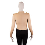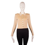 This Tom Ford slim-fit bodysuit is crafted from a structured stretch knit in an elegant beige hue. It features a sharp point collar, long sleeves, and a front placket finished with signature gold-tone buttons for a polished, tailored look. Designed to sit smoothly under trousers or skirts, the body-hugging silhouette and snap-closure gusset create a seamless, streamlined finish—perfect for pairing with high-waisted pieces for chic day-to-night styling.