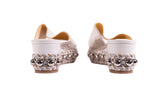 These Christian Louboutin Ball wedges feature a striking silver and white design with a modern slide-on silhouette that blends luxury with playful elegance. Crafted with a metallic mesh upper, they are set atop a distinctive wedge sole detailed with braided trim and signature spherical metal embellishments that add texture and visual interest. The cushioned footbed and platform wedge provide comfort and lift, making them ideal for statement daytime wear or elevated resort styling.
